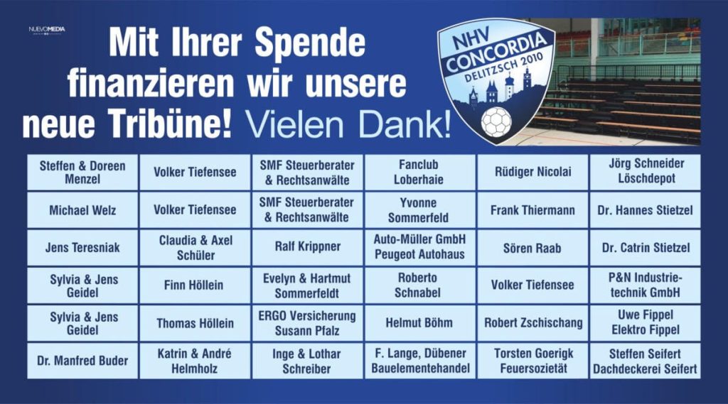 Um die Attraktivität der neuen Heimspielstätte zu erhöhen, hat der NHV Concordia Delitzsch zu Beginn der Saison 2016/17 in neue, mobile Tribünensysteme investiert. Entstanden sind 222 neue Sitzplätze, die allesamt ohne Einschränkungen oder Kompromisse eine ungehinderte Sicht auf das gesamte Spielfeld ermöglichen. Spenden sind bei einem solchen Projekt natürlich hochwillkommen. Der Verein bedankt sich ganz herzlich für Ihr Engagement!